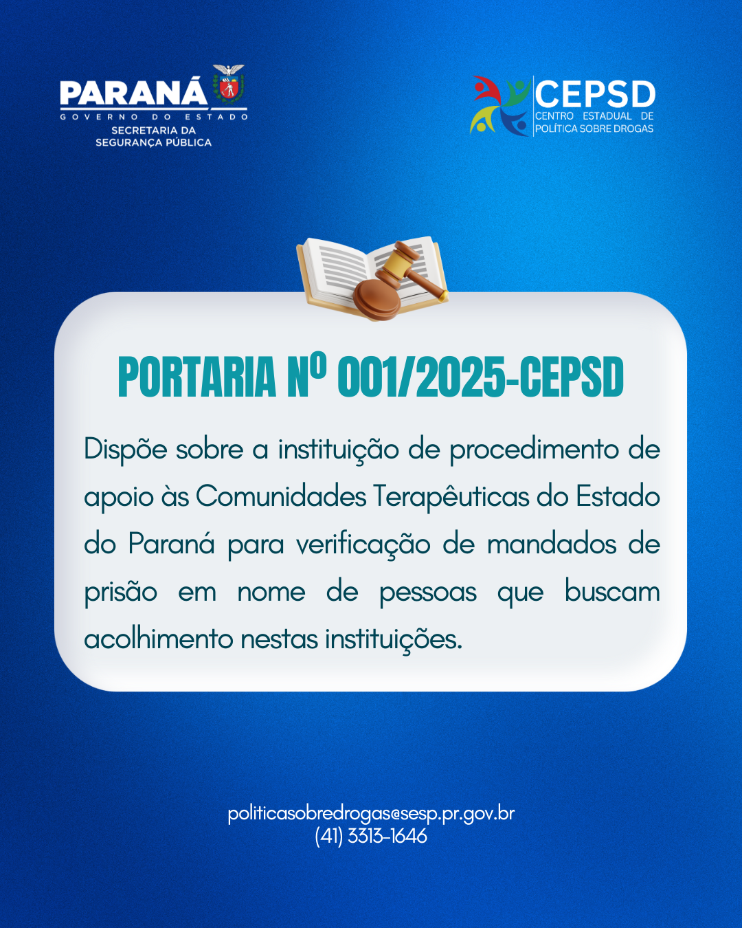 O Centro Estadual de Políticas Sobre Drogas (CEPSD), vinculado à Secretaria de Estado da Segurança Pública do Paraná (SESP-PR), publicou nesta quarta-feira (23/10) a , que institui um novo procedimento de apoio às Comunidades Terapêuticas do Estado.