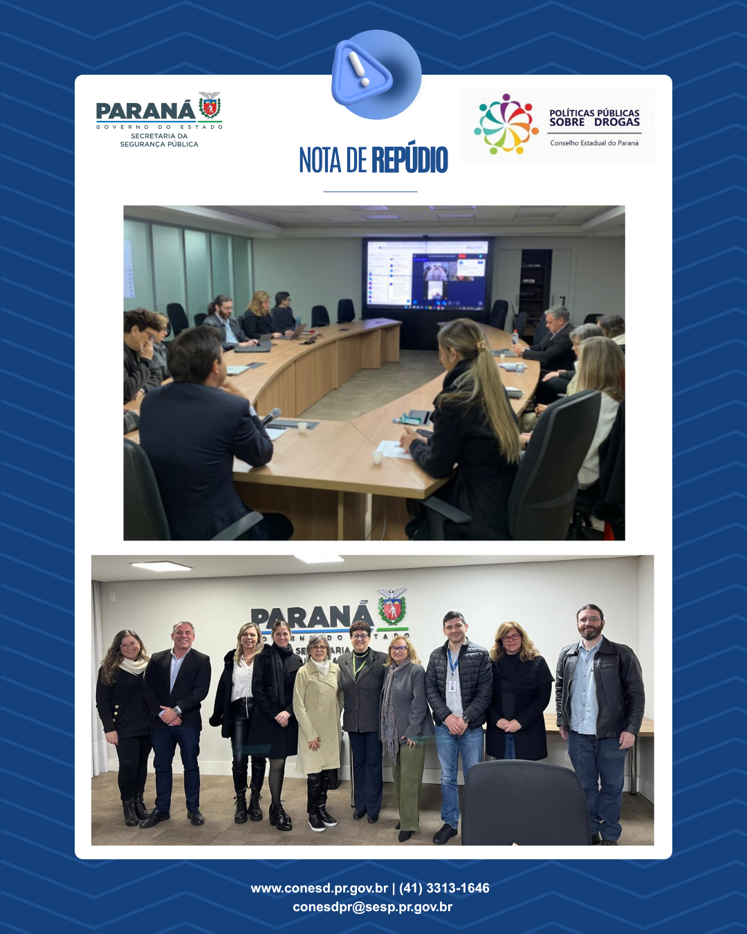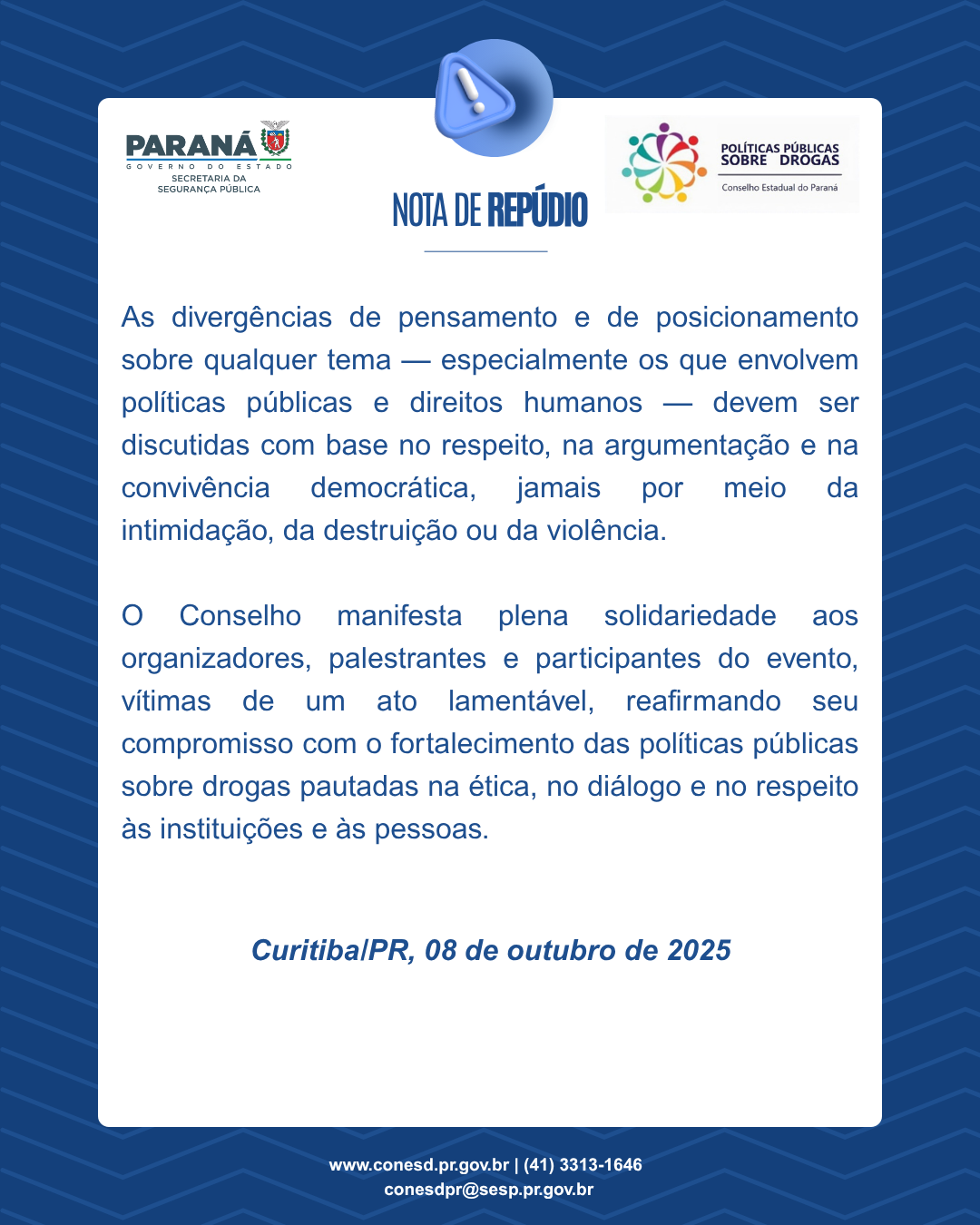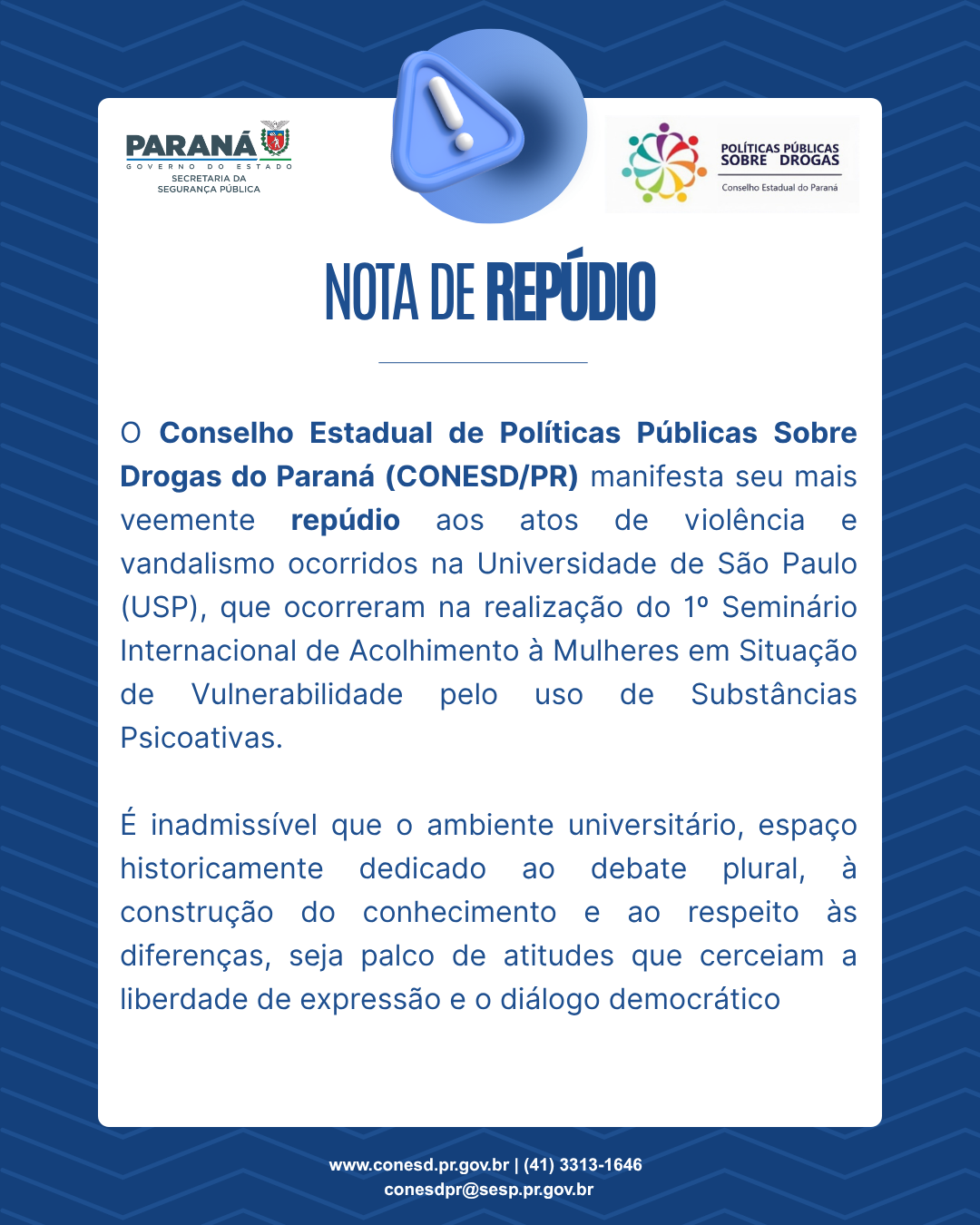 aos atos de violência e vandalismo ocorridos na Universidade de São Paulo (USP) durante a realização do 1º Seminário Internacional de Acolhimento a Mulheres em Situação de Vulnerabilidade pelo Uso de Substâncias Psicoativas.O posicionamento foi definido durante a 9ª Reunião Ordinária do colegiado, realizada na sede da Secretaria de Estado da Segurança Pública (SESP), em Curitiba. A decisão reflete a preocupação do Conselho com o impacto de episódios de intolerância em espaços acadêmicos, tradicionalmente dedicados ao debate plural, à construção do conhecimento e ao respeito às diferenças.