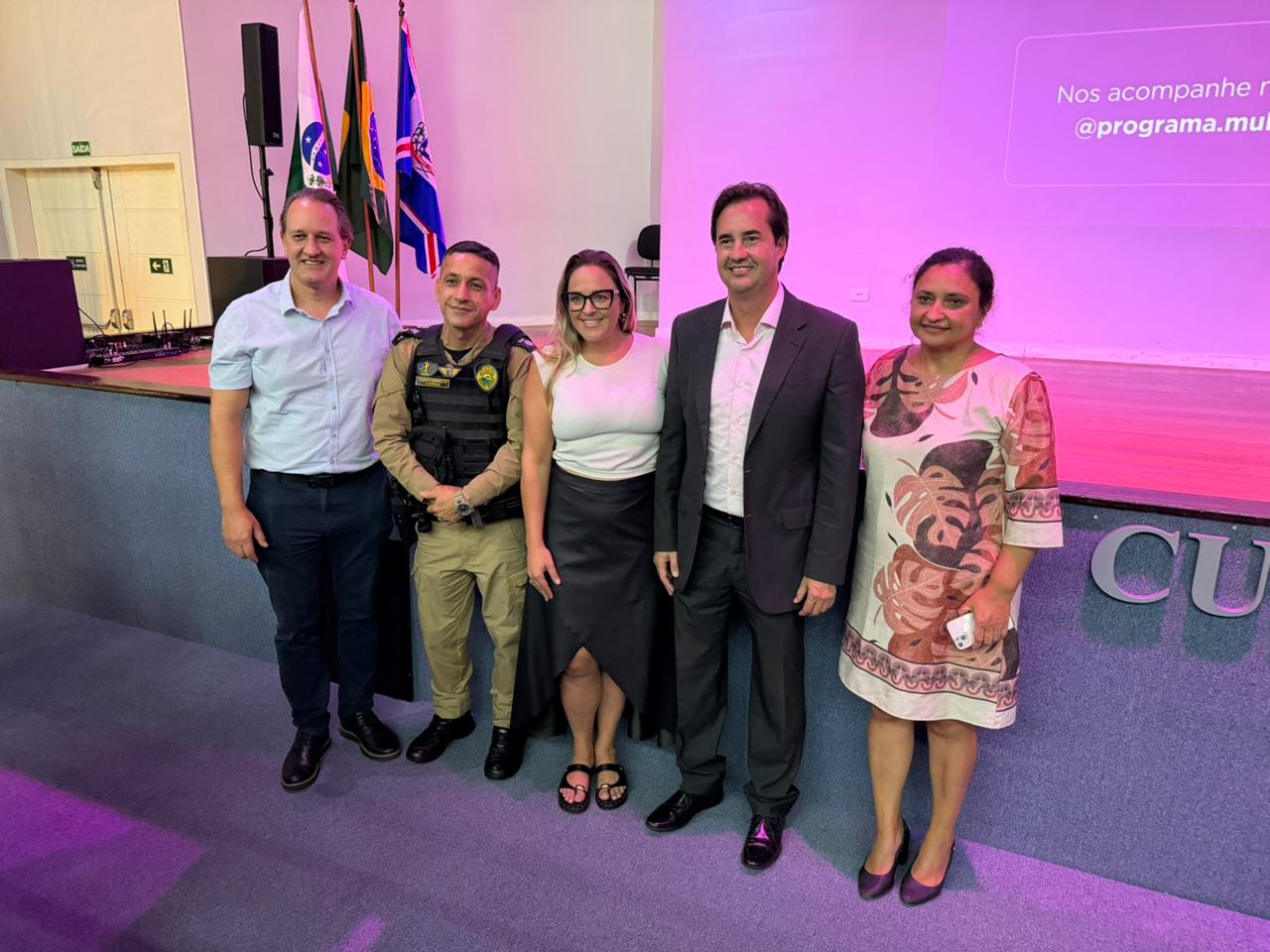 PRESENÇAS – Participaram da iniciativa a vice-prefeita de Campo Largo, Chrystiane Chamin; os secretários municipais Fabiano Andreassa e Dorotéa Aparecida Merchiori Stocoz (Desenvolvimento Social e da Mulher e Cultura); os vereadores Alexandre Guimarães, presidente da Câmara Municipal, e Athos Martinez; a diretora da Mulher de Campo Largo, Suelen Turera; a procuradora da Mulher da Câmara Municipal, Melissa Rúbia Pinheiro Pereira; além de representantes das forças de segurança que atuam no município.
